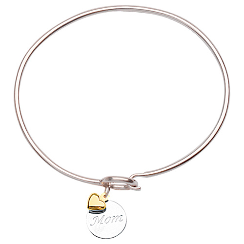 This sterling silver Mom disc bangle bracelet features a 1/4in hollow 14kt yellow gold heart charm. Disc diameter: 1/2in, half the size of a quarter. Bangle fits wrist sizes up to 8in. Item weight: 7.6 grams. Import.