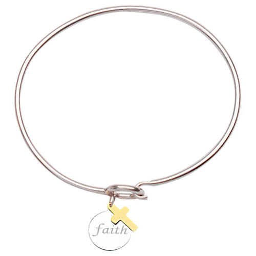 This sterling silver Faith disc bangle bracelet features a 1/4in hollow 14kt yellow gold cross charm. Disc diameter: 1/2in, half the size of a quarter. Bangle fits wrist sizes up to 8in. Item weight: 7.6 grams. Import.