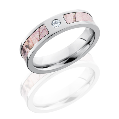 Cobalt chrome camo ring features pink Realtree AP inlay with diamond accent. Width: 5mm. Ring has a flat center and polished edges. Round full cut diamond accent is .05 ct tw. Deluxe comfort fit ring is handcrafted in the USA. Please use a narrow ring sizer when sizing your finger. Ring is available in finger sizes 5 to 10. This ring is officially licensed by Realtree. Please note, each camo ring is made to order, thus slight variations in camouflage occur. Each ring has its own unique pattern. No two camo rings are identical.