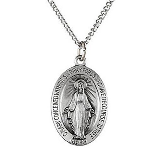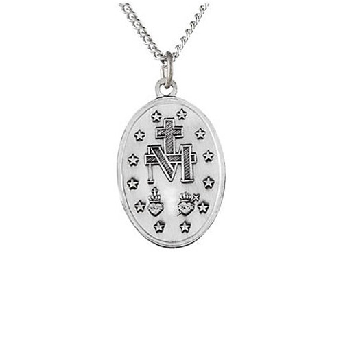 Die struck, oval miraculous medal necklace is made of sterling silver with antique finish. It has a sterling silver, 18-inch flat curb chain. Dimensions: 19mm by 13.75mm. This item is the size of a penny. The back of medal features an M, surmounted by a cross, with 2 hearts and 12 stars. Weighs 1.6 grams.