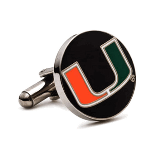 University of Miami cufflinks are made of stainless steel. Each pair of officially licensed cufflinks ships in an elegant red foldover box..Item details:Approximately 3/4in x 1/2inEnamel and rhodium platedBullet back closure