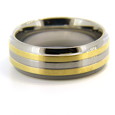 This titanium ring has two gold-plated stripes all the way around. Ring width: 8mm, thickness 2.5mm. Available in whole finger sizes 8-12 only. Comfort fit. Made of commercially pure [CP] titanium in China.Item details:18k yellow gold platingSatin flat centerPolished beveled edges