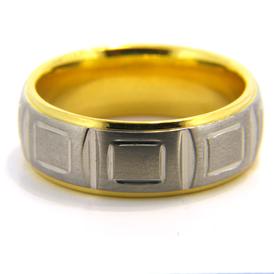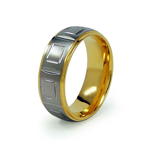 Titanium ring has a grooves and panels design on the outside and yellow gold-plated edges and interior. Ring width: 8mm, thickness 2.5mm. Available in whole finger sizes 8-12 only. Comfort fit. Made of commercially pure [CP] titanium in China.Item details:18k yellow gold platingSatin finishGrooves and panels
