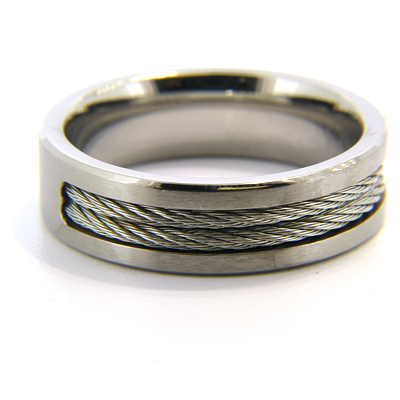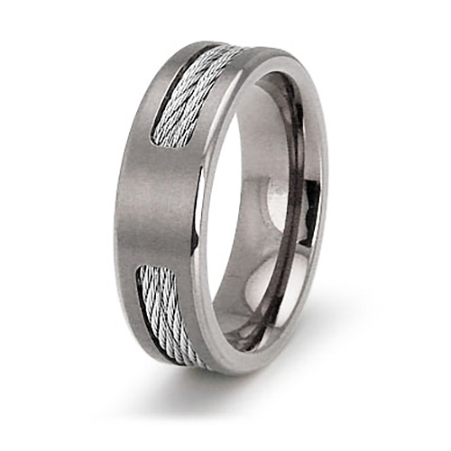 This men's titanium wedding band features two steel cable inlays. Ring width: 7mm, thickness 2.5mm. Comfort fit. Made of commercially pure [CP] titanium in China.