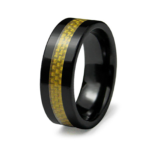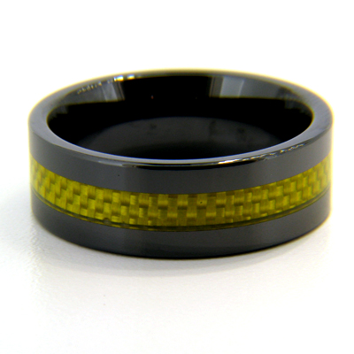 Yellow carbon fiber inlay, black ceramic band. High polish finish, flat center. Width: 8mm. Available in whole finger sizes 9-12 only. Comfort fit. Imported.