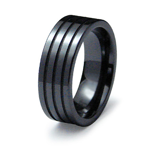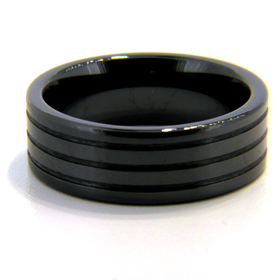 Black ceramic band. Polished flat center and grooves. Width: 8mm. Available in whole finger sizes 9-12 only. Comfort fit. Imported.