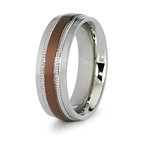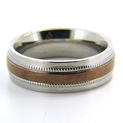 Men's stainless steel ring features 18kt rose gold plating and milgrain center. Width: 8mm. Available in whole finger sizes 8-12 only. Comfort fit, hypoallergenic. Imported.
