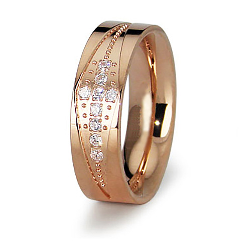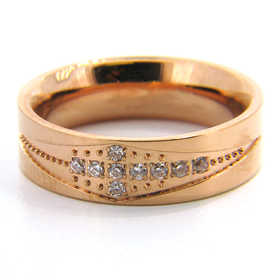 Ladies' stainless steel ring features 18kt rose gold plating. Nine cubic zirconias, cross design. Width: 5mm. Available in whole finger sizes 6-8 only. Comfort fit, hypoallergenic. Imported.
