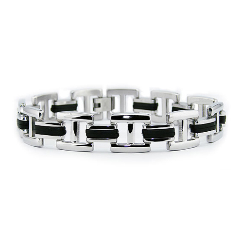 Stainless steel bracelet is 8 1/2 inches in length, width 14mm. Black rubber inlay, high polish finish. This bracelet is composed of grade 316 stainless steel. Stainless steel will not oxidize [rust] nor turn black. Imported.