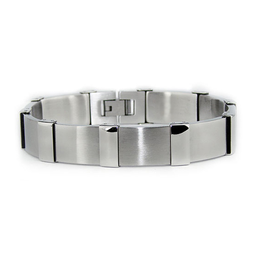 Bracelet is 8 1/2 inches in length, width 12mm. Satin and high polish links. This bracelet is composed of grade 316 stainless steel, known for its superior corrosion resistance. 316 steel is commonly used in stainless steel jewelry. Insist on 316 stainless steel. 316 stainless steel is also known as marine grade stainless steel, for its high resistance to chloride corrosion. Stainless steel will not oxidize [rust] nor turn black. Imported.