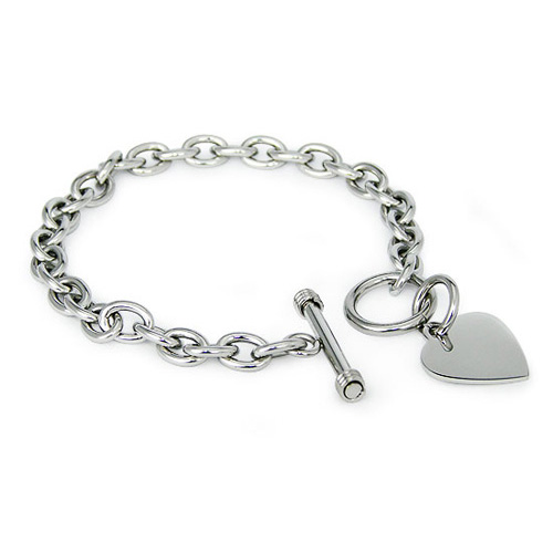 Stainless steel bracelet is 7 1/2 inches in length. Heart charm, toggle clasp. High polish links. This bracelet is composed of grade 316 stainless steel. Stainless steel will not oxidize [rust] nor turn black. Imported.