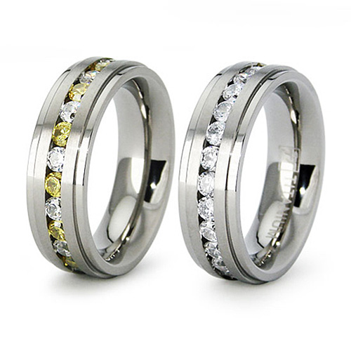 This ladies' titanium eternity band is available in whole finger sizes 6-8 only. Comfort fit. Ring width: 6.5mm. Made of commercially pure [CP] titanium in China.Item details:Round brilliant cubic zirconias, channel set. Alternating white and yellow cubic zirconias on one side; white cubic zirconias on the otherSatin finish center High polish step down edges