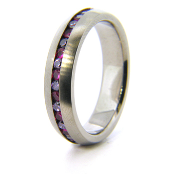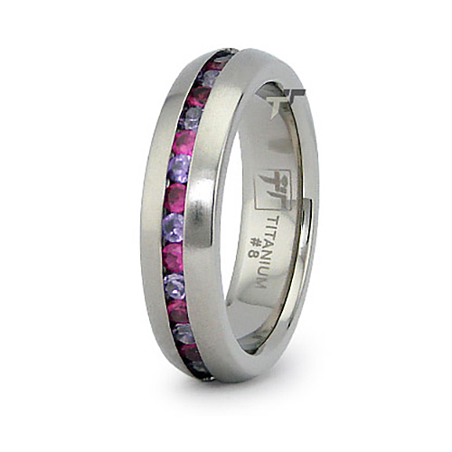 Titanium ring features pink and purple cubic zirconia. Ring width: 5.5mm, thickness 2.5mm. Available in whole finger sizes 5-8. Comfort fit. Made of commercially pure [CP] titanium in China. Available while supplies last!Item details:32 cubic zirconias, channel setAlternating pink and purple round brilliant cubic zirconiasSatin finish