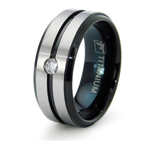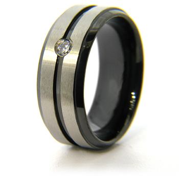 Black-plated titanium ring has a single cubic zirconia accent. Ring width: 8mm, thickness 2.5mm. Available in whole finger sizes 6-8 only. Comfort fit. Made of commercially pure [CP] titanium in China.Item details:Round brilliant cubic zirconia, bezel setBlack plated titanium - physical vapor deposition [PVD]Grooved centerSatin finish