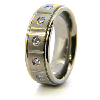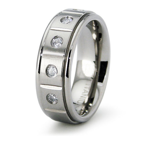 Ring width: 7mm. This ladies' titanium band is available in whole finger sizes 6-8 only. Comfort fit. Made of commercially pure [CP] titanium in China.Item details:Five round brilliant cubic zirconias, bezel set.High polish step down edges, satin finish center