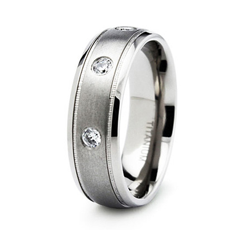 Titanium ring details:3 round brilliant white cubic zirconiasSatin centerPolished milgrain edges Ring width: 7mm. Available in whole finger sizes only. Comfort fit. Made of commercially pure [CP] titanium in China.