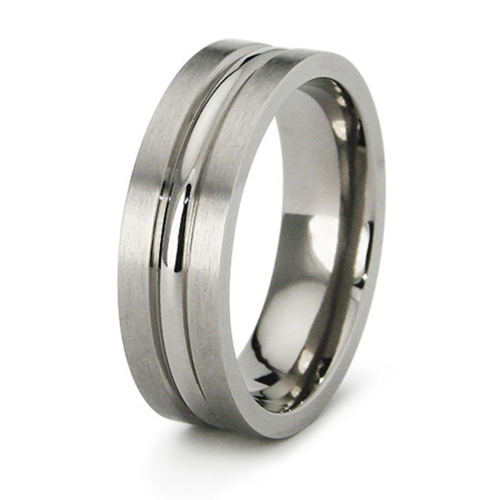 Titanium ring has a polished ribbed center and brushed edges. Width: 7mm. Available in whole and half finger sizes 6-12. Comfort fit. Made of commercially pure [CP] titanium. Imported.
