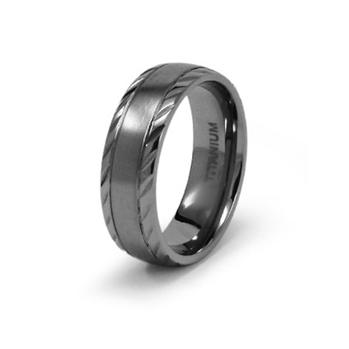 This classic titanium ring design features a satin flat center with patterned edges. Available in whole finger sizes 8-12 only. 7mm width. Comfort fit. Made of commercially pure [CP] titanium in China.