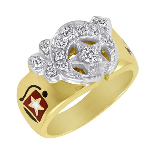 Solid back, polished 10kt yellow gold Shrine ring. Slightly tapered shank features enamel fez and camel side emblems. Round brilliant diamond accents: 1/2 ct tw. Item weighs approximately 16.5 grams. This item is handcrafted in the USA.