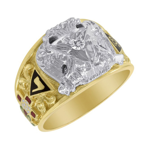 Solid back polished 10k yellow gold Scottish Rite ring has a 1/10 ct round diamond and a wide shank. This ring features a large 10k white gold double eagle on top. Side emblems: Rose croix, Yod and 32nd degree. One round brilliant diamond weighs 1/10 ct tw. Double headed eagle dimensions: 14.5mm x 15.5mm. Item weighs approximately 12.6 grams. This item is handcrafted in the USA.