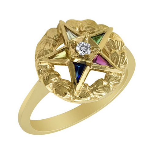 Open back, solid 14k yellow gold Eastern Star ring has a diamond accent. Single round brilliant diamond accent weighs: .04 ct tw. Diamond color H-I, clarity I1. Multi colored spinel gemstones. Item weighs approximately 4.4 grams. This item is handcrafted in the USA.