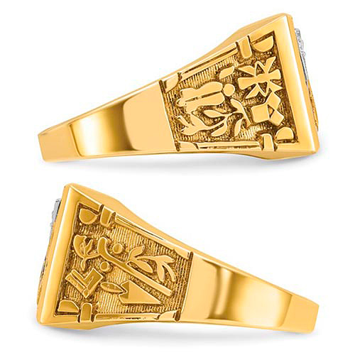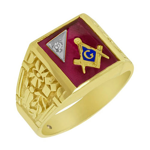 Polished 10k yellow gold masonic ring has a solid back. Square red synthetic stone features a compass and set square symbol. Wide shank features all-seeing eye, plumb bob and trowel side emblems. Diamond accent: .02 ct tw. Diamond color H-I, clarity I1. Item weighs approximately 10.6 grams. This item is handcrafted in the USA.