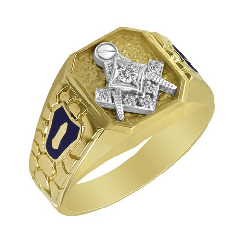 10k yellow gold masonic ring has an octagonal signet top with 10k white gold compass and square symbol festooned with diamond accents. Mosaic patterned shank features blue enamel plumb bob and trowel side emblems. Diamond accents .10 ct tw. Diamond color H-I, clarity I1. Open back. Item weighs approximately 7 grams. This item is handcrafted in the USA.