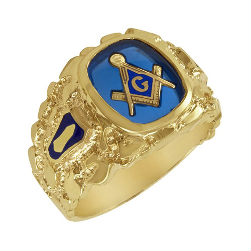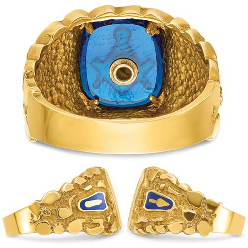 Open back, polished 10kt yellow gold masonic ring has textured sides. Oblong blue synthetic stone is topped with a compass and set square symbol. Textured shank features blue enamel plumb bob and trowel side emblems. Item weighs approximately 9.1 grams. This item is handcrafted in the USA.