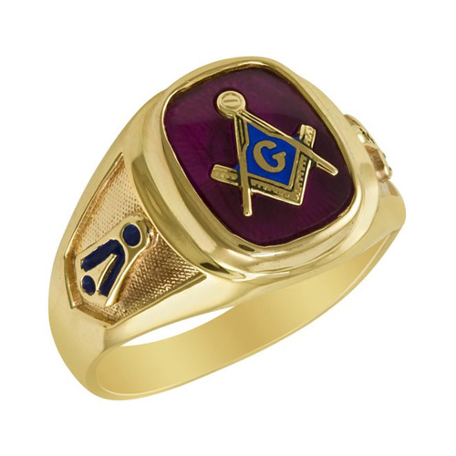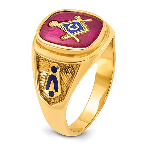 10k yellow gold masonic ring has an oblong red synthetic stone topped with a compass and set square symbol. Notched shank features blue enamel plumb bob and trowel side emblems. Closed back. Item weighs approximately 7.5 grams. This item is handcrafted in the USA.