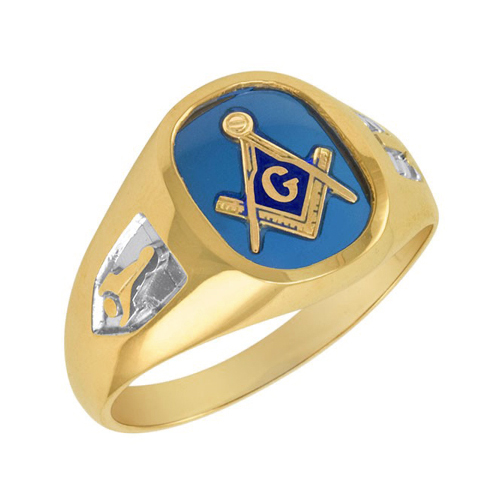 Open back 14 yellow gold masonic ring has two-tone side emblems. Oblong 12mm x 10mm blue synthetic stone is topped with a compass and set square symbol. Tapered shank features plumb bob and trowel side emblems. Item weighs approximately 4.2 grams. This item is handcrafted in the USA.