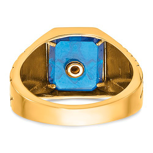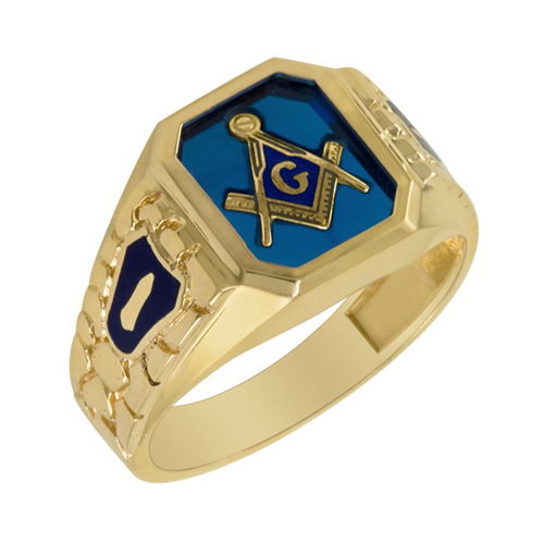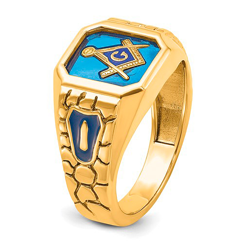 Open back 10k yellow gold masonic ring has a cobblestone texture. Octagonal blue synthetic stone is topped with a compass and set square symbol. Textured shank features blue enamel plumb bob and trowel side emblems. Stone size: 12mm x 10mm. Ring top width: 13.4mm. Item weighs approximately 5.9 grams. This item is handcrafted in the USA.