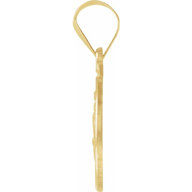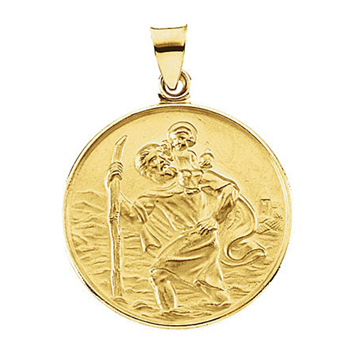 Polished 18kt yellow gold St Christopher medal has no inscription. Dimensions: 13mm diameter, half the size of a quarter. Weighs 1.53 grams. Please note: weight is approximate, actual weight may vary. Chain not included.