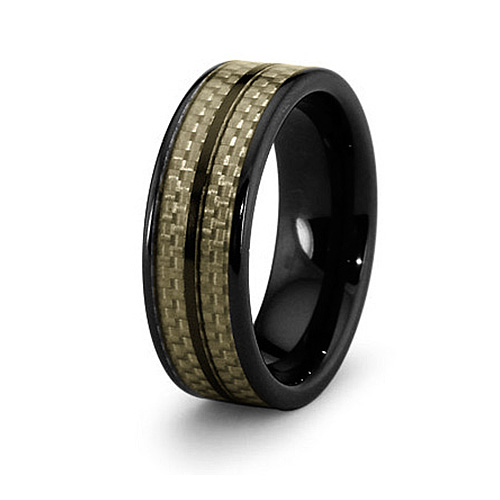 Black ceramic ring features two carbon fiber inlays. Ring width: 8mm. Men's ring is available in whole and half finger sizes 8-12 only. Comfort fit. Made of black ceramic in China. Flat center and polished flat edges.