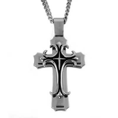 This large fancy men's cross pendant is made of black-plated stainless steel. Dimensions: 2in x 1 1/4in. The cross dangles from a 24in curb chain. This item is composed of grade 316L stainless steel. Imported.