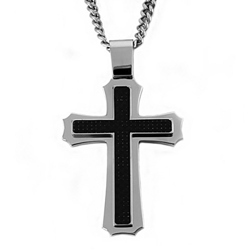 Dimensions: 2in x 1 1/4in. Black carbon fiber inlaid cross with 24in curb chain. This item is composed of grade 316L stainless steel, known for its superior corrosion resistance. Nickel free. 316L steel is also known as marine grade stainless steel, for its high resistance to chloride corrosion. Stainless steel will not oxidize [rust] nor turn black. Imported.