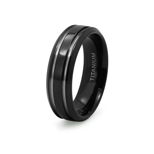 Black plated titanium ring has two grooves. Ring width: 8mm. Comfort fit. Beveled edges. Made of commercially pure [CP] titanium in China.