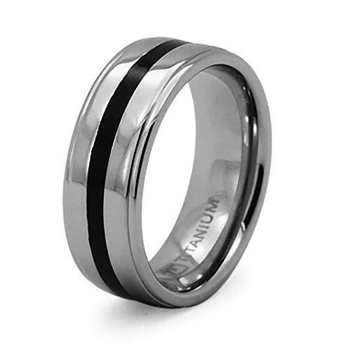 Titanium ring has a black enamel inlay. Ring width: 8mm. Comfort fit. Made of commercially pure [CP] titanium in China.Item details:Black enamel inlayGray titanium center with polished finishRidged edges