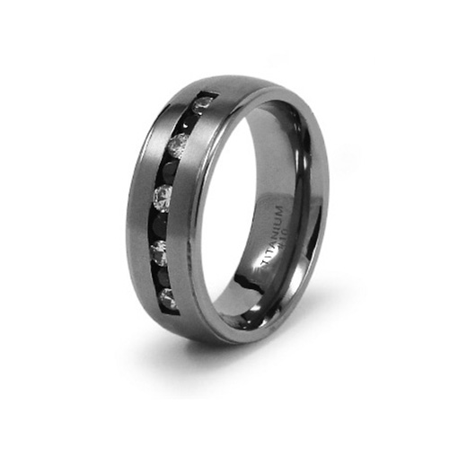 Titanium ring has channel set black and white cubic zirconia accents. Ring width: 6mm. Comfort fit. Satin finish. Polished ridged edges. Made of commercially pure [CP] titanium in China.