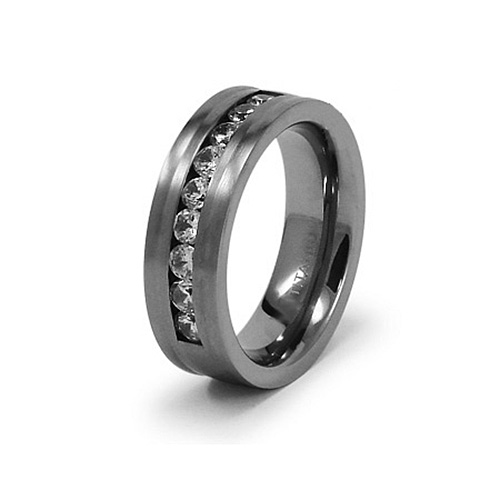 Titanium ring width: 7.5mm. Comfort fit. Made of commercially pure [CP] titanium in China.Item details:Round brilliant cubic zirconia accents, channel setSatin flat centerEmbossed edges