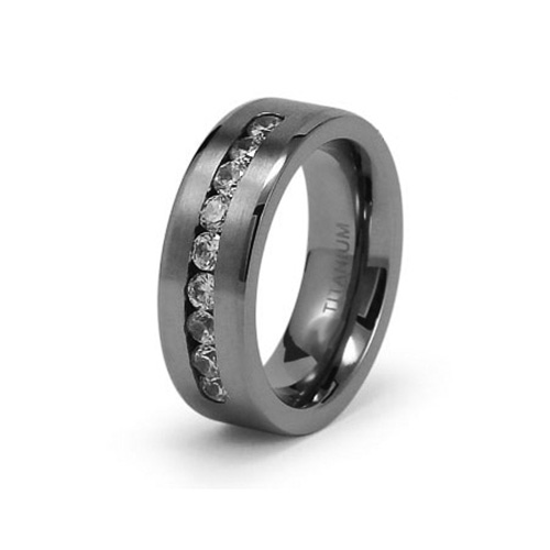 Satin finish titanium ring has cubic zirconia accents. Ring width: 8mm. Comfort fit. Made of commercially pure [CP] titanium in China.Item details:Nine round brilliant cubic zirconia accents, channel setSatin flat centerHigh polish beveled edges