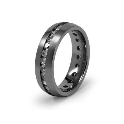 Titanium eternity ring has round cubic zirconia accents all the way around the ring. Ring width: 7mm. Available in select sizes while supplies last. Comfort fit. Made of commercially pure [CP] titanium in China.Item details:Cubic zirconias encircle the band, channel setDomed center with satin finish