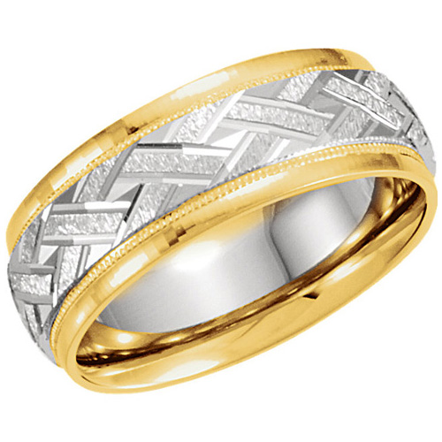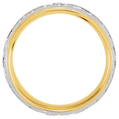 Made to order! Polished 18k yellow gold and platinum 950 wedding band. Hallmark PLAT on the interior. Comfort fit. 7mm width. This ring uses a 18k yellow gold channel sleeve with a center insert of platinum for a bi-colored appearance only on the outside of the band. Order matching platinum bands for men and women. Size 10 band weighs approximately 13.03 grams. This band is composed of 95% platinum and 5% cobalt. This alloy has minimal porosity.