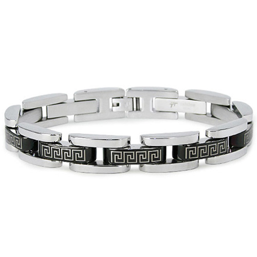 Stainless steel Greek key bracelet is 8 1/2 inches in length and 11mm wide. High polish metal links alternate with a black, laser engraved Greek Key pattern. One size fits most.This bracelet is composed of grade 316 stainless steel, known for its superior corrosion resistance. 316 steel is commonly used in stainless steel jewelry. Insist on 316 stainless steel. 316 stainless steel is also known as marine grade stainless steel, for its high resistance to chloride corrosion. Stainless steel will not oxidize [rust] nor turn black. Imported.