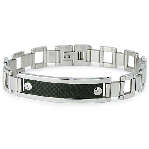 Stainless steel bracelet has black carbon fiber contrasts with high polish steel links. Length: 8in; width: 11mm. Screw accents. This bracelet is composed of grade 316 stainless steel, known for its superior corrosion resistance. 316 steel is commonly used in stainless steel jewelry. Insist on 316 stainless steel. 316 stainless steel is also known as marine grade stainless steel, for its high resistance to chloride corrosion. Stainless steel will not oxidize [rust] nor turn black. Imported.