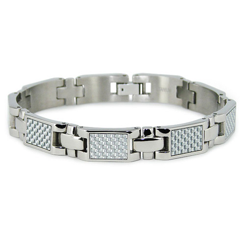 Titanium bracelet has white carbon fiber accents and a polished finish. Length: 8.25in, width: 10mm. Stainless steel clasp. Hypo-allergenic. Made of commercially pure [CP] titanium in China. Engraving not available.