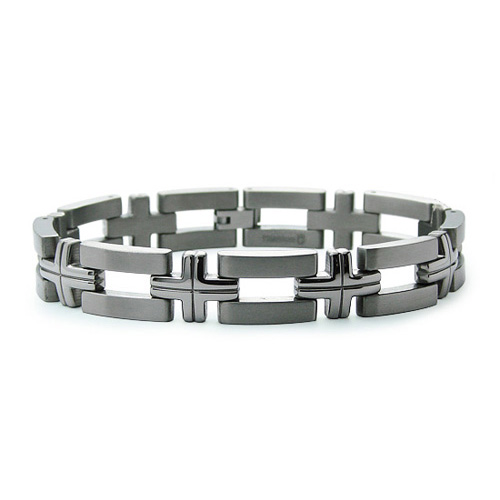 Length: 8.5in, width: 12mm. Satin finish large links, polished small links. Hypo-allergenic. Made of commercially pure [CP] titanium in China. Engraving not available.