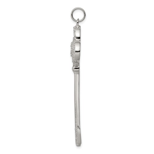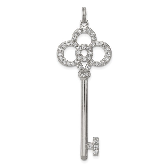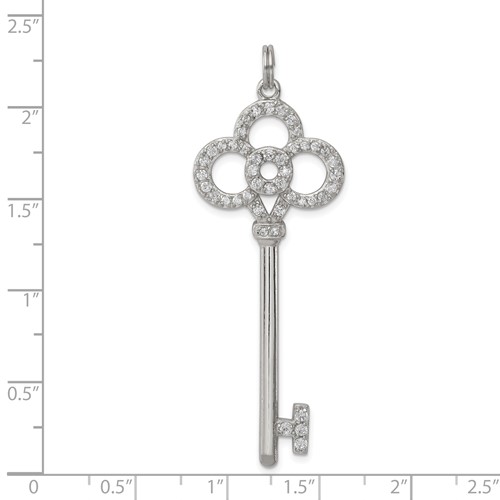 Polished, sterling silver key pendant features cubic zirconia accents. This item weighs approximately 3.74 grams. Dimensions: 3/4in x 2in. Chain not included.