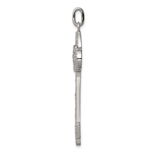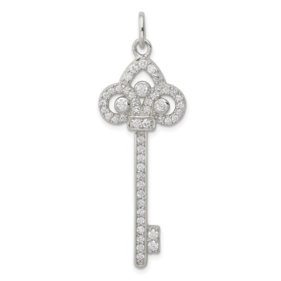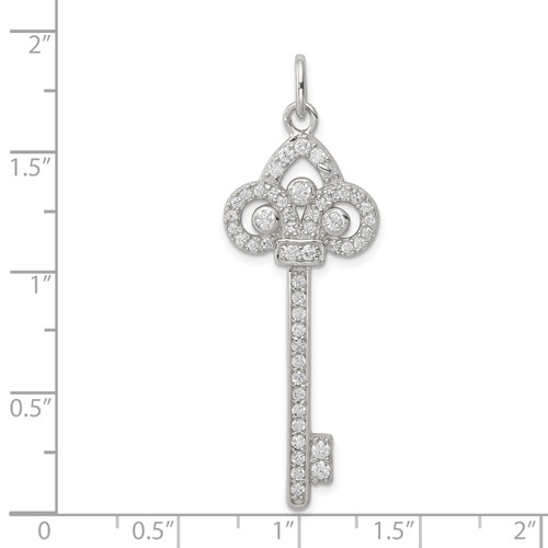 Polished, sterling silver key pendant is decorated with round brilliant cubic zirconia accents. Dimensions: 3/4in x 1 3/4in. Item weighs approximately 3.25 grams. Chain not included. Import.