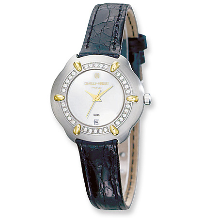 This genuine Charles-Hubert Paris watch #18302D-L/W has a round white dial with date and a black leather strap. Strap is 7 inches long. 28mm case. Includes a gift box and warranty card. Stainless steel case and casebook. Genuine crocodile leather band. Sapphire crystal, 1/3 CT TW diamonds and 18k yellow gold accents on bezel. Round brilliant diamonds are G-H color, VS clarity. Gold-tone hands and markers. Swiss ETA movement. Water resistance tested to 3 ATM. Each Charles-Hubert Paris watch is backed by a lifetime buckle-to-buckle or lifetime warranty on movement.