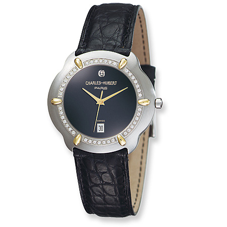 This genuine Charles-Hubert Paris watch includes a gift box and warranty card.Charles Hubert watch model #18302D-JBlack dial with dateStainless steel case and casebackGenuine crocodile leather bandSapphire crystal, 1/2 CT TW diamonds and 18k yellow gold accents on bezelRound brilliant diamonds are G-H color, VS clarityGold-tone hands and markersSwiss ETA movementWater resistance tested to 3 ATMWarranty InformationEach Charles-Hubert Paris watch is backed by a lifetime buckle-to-buckle or lifetime warranty on movement.
